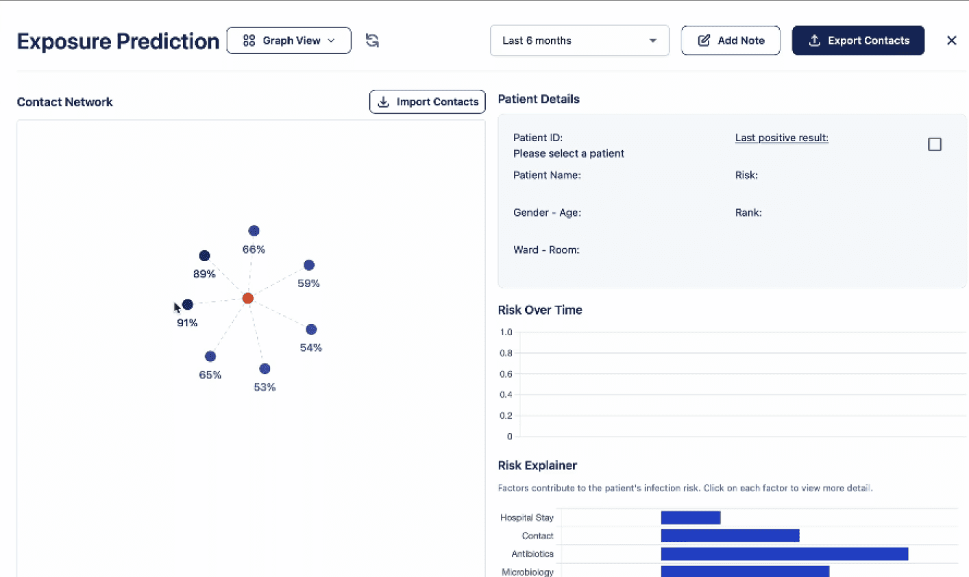 NEX Infection Intelligence identifies high-risk contacts exposed to a source CRE case, with predicted risk of testing positive.